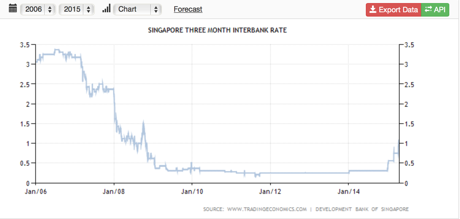 The Singapore Interbank Offered Rate (SIBOR) for 3 months as of 16 April 2015 stands at 0.94654 points while the pre 2007-2008 level was harbouring around 3 points as can be seen in the chart below.