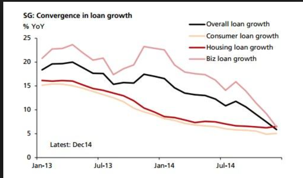 Since the Monetary Authority of Singapore (MAS) doesn’t conduct as big open market operations as the US Feds, the data above provided evidence that businesses and consumers were not over borrowing as compared to the pre 2007-2008 financial crisis. As such it was unlikely that over speculation exists in the Singapore market. Even though there showed no signs of speculation, it could be that the market is currently over valued. In the chart below, it provides data on the loan growth in Singapore. As at the end of 2014, loan growth to businesses fell from 9.2% to 6.4% previously while loans to the manufacturing sector plunged by 6.3%. Loans to the petroleum-related industry also moderated sharply to 27.3%, from 63.3% in November could be mainly due to the plunge in oil prices. Such data indicates a slowdown in business activity.